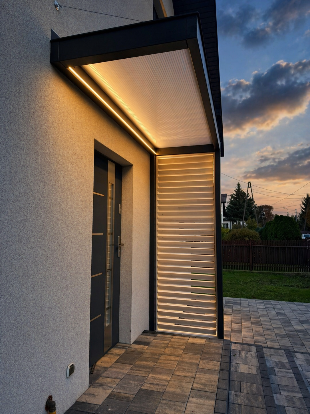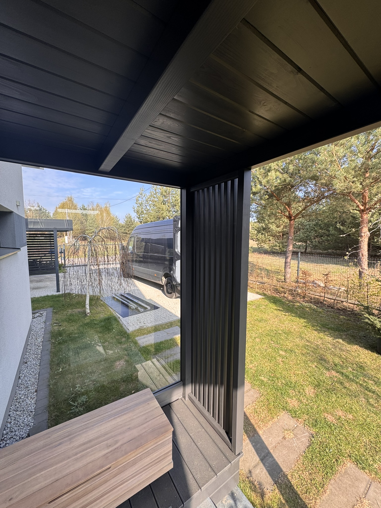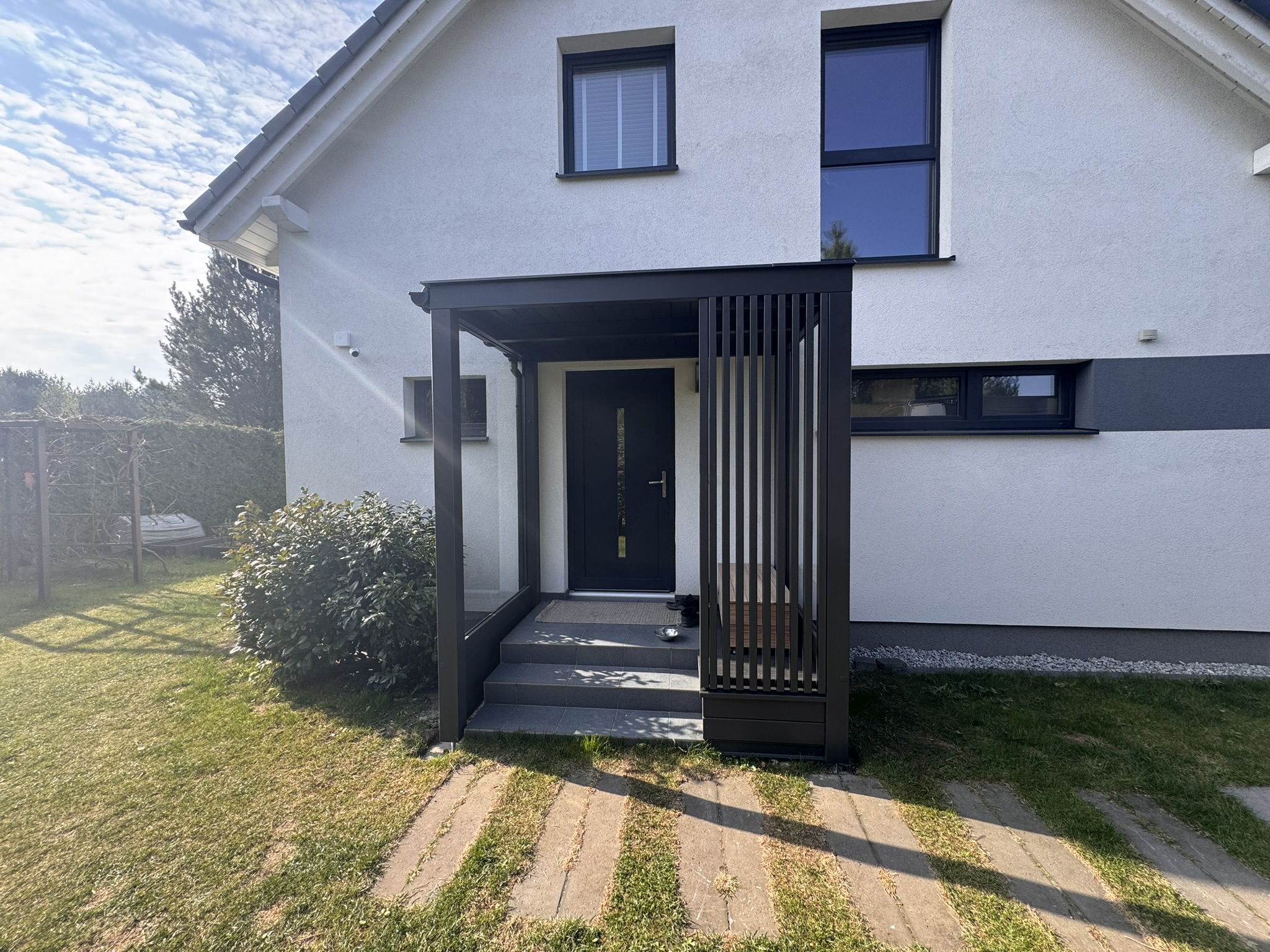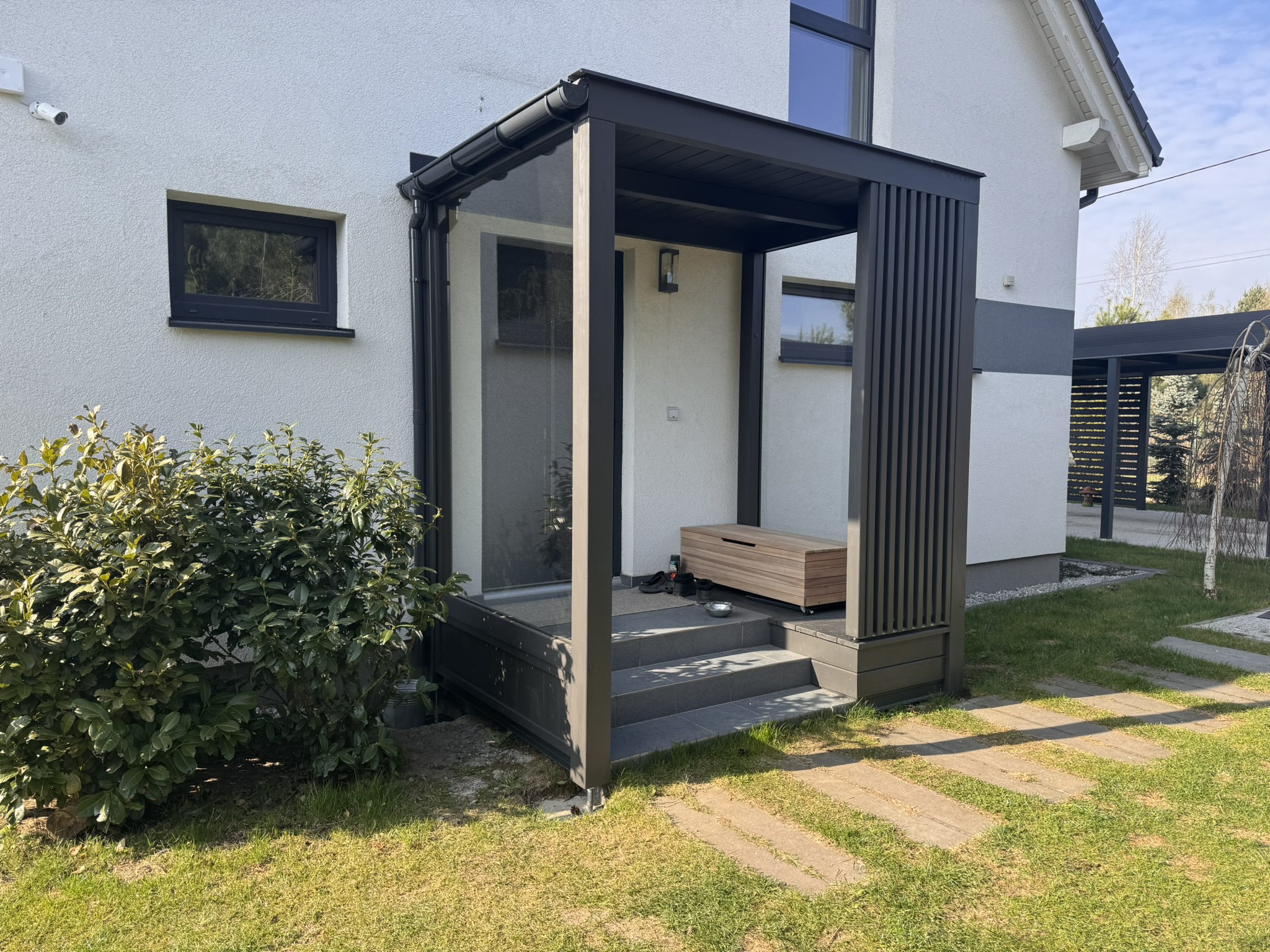 ZADASZENIA – Stylistyka naszych zadaszeń współgra zarówno z budynkami nowoczesnymi, jak i tymi bardziej klasycznymi o różnorodnej kolorystyce. Motyw przewodni to ukryty kąt nachylenia połaci, sprawiający że zewnętrzny obrys konstrukcji biegnie w linii poziomej tworząc przy tym jednorodną bryłę. Brak wsporników przy ścianie to lepsze zagospodarowanie przestrzeni, a masywne elementy konstrukcji nadają całości charakteru.